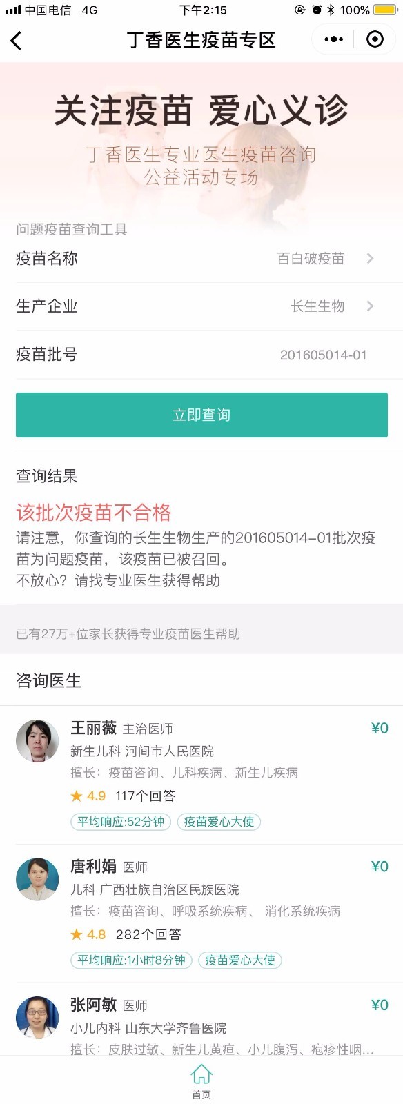 该功能上线仅1分钟,就有一位来自河北的用户,选择了秦皇岛市第一医院小儿内科主治医师曹医生进行了咨询。“孩子打的不是问题批次的疫苗,但都是同一家公司的,会不会也有问题?有什么检查可以验证疫苗是否有效吗?”