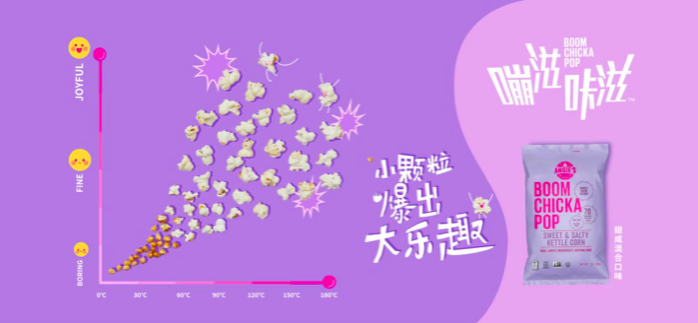 跟恋暖初茶致力于做健康奶茶一样,“健康”也同样是嘣滋咔滋的品牌初心。2001年,品牌创始人Angie因为在市面上买不到健康的爆米花,于是用最简单的原料自制成了Angie’s Kettle Corn, 这便是嘣滋咔滋的前身。嘣滋咔滋爆米花均使用非转基因玉米,符合全谷物、无麸质的健康品质标准,所有的食材特征都以简明又不失俏皮的健康标识印刻于包装袋上,也成为品牌一大独具辨识度的特色。嘣滋咔滋自创立之初就在美国掀起了健康零食风潮,并获得众多主流媒体的争相报道。