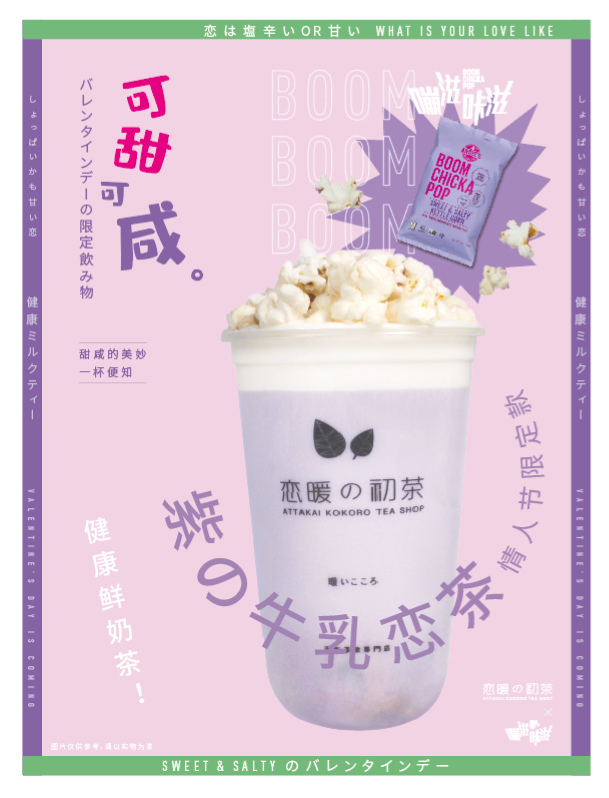 【2020年3月,上海】红遍美国社交网络的爆米花品牌嘣滋咔滋BoomChickaPop正式来到中国,携手品质连锁奶茶店恋暖初茶,带来白色情人节专属联名产品。嘣滋咔滋爆米花源自美国,以“真实、简单的原料成分”为产品研发原则,对健康的坚守令其收获了众多零食爱好者的青睐。